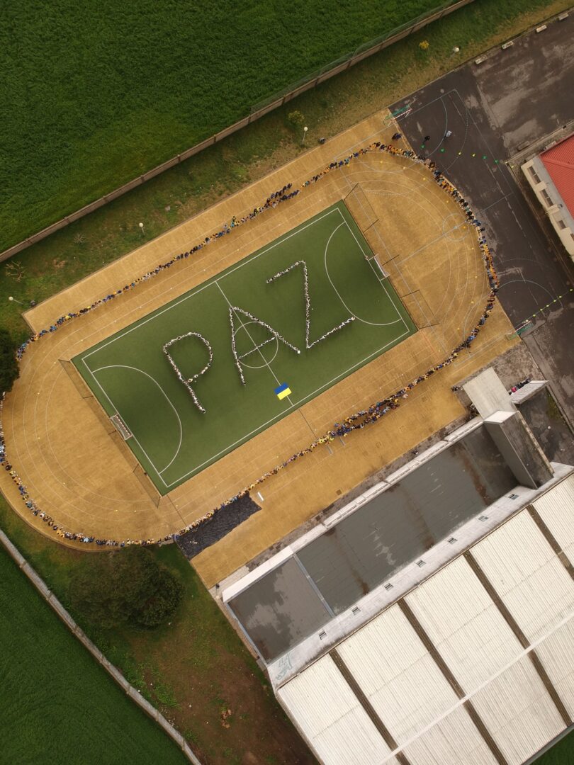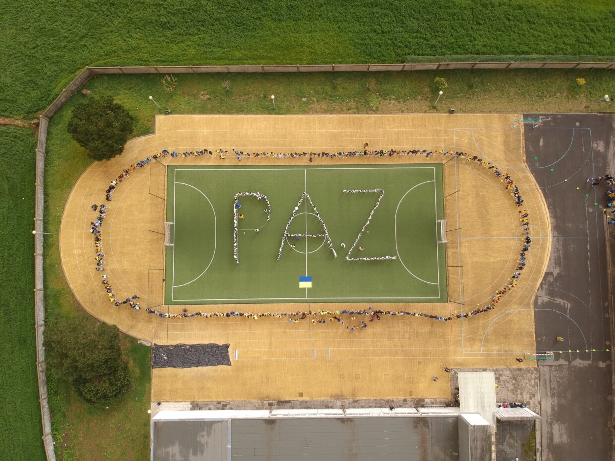 Os alunos do 1º, 2º e 3º ciclos da Escola Básica de Rates escreveram, no campo de futebol do estabelecimento de ensino, uma mensagem apelando à paz na Ucrânia. A iniciativa foi realizada em paralelo a uma recolha de bens e alimentos, que serão enviados para o país.