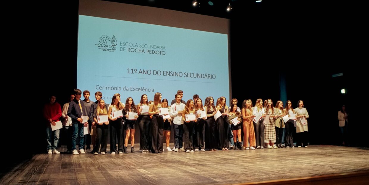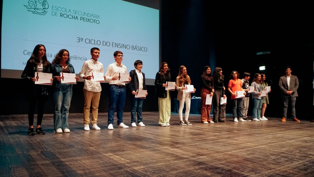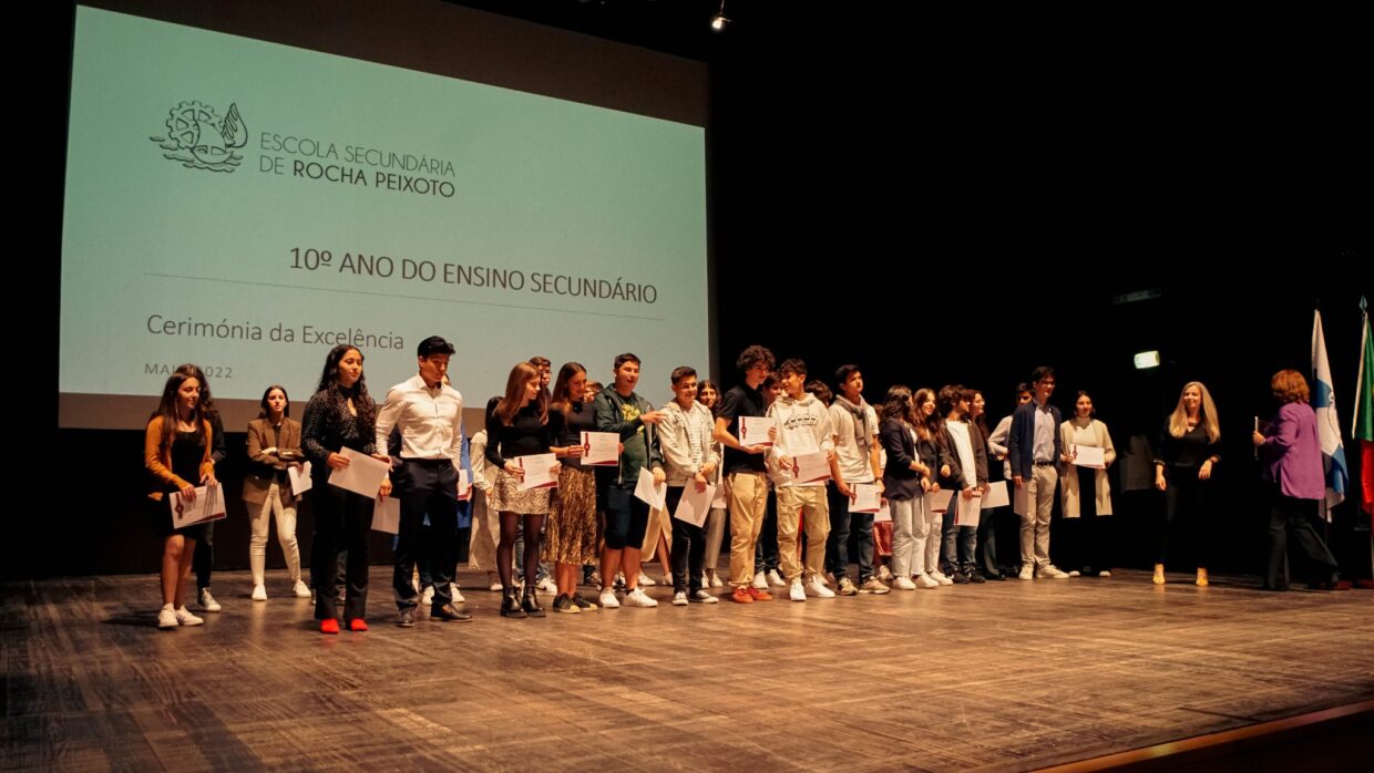 A Cerimónia de Excelência da Escola Secundária Rocha Peixoto teve lugar na terça-feira da semana passada, dia 24 de maio. Inserida nas comemorações do Dia da Escola, a sessão homenageou alunos do 3º ciclo e do Ensino Secundário com as melhores notas, destacando-se pelo “trabalho e empenho”, diz a escola.