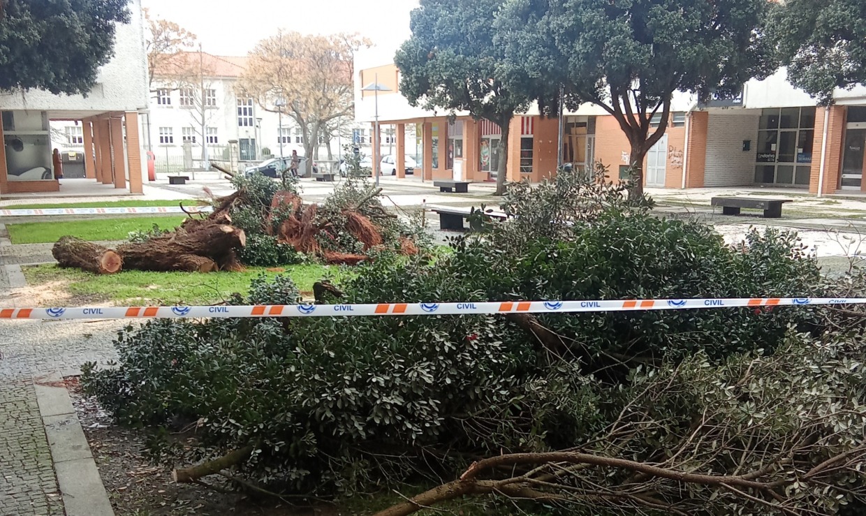 De acordo com informações recolhidas, a árvore tombou parcialmente sobre a zona pedonal sem registo de feridos. As equipas da Proteção Civil procederam ao corte e remoção dos ramos que representavam perigo iminente, tendo delimitado temporariamente parte da praça para evitar a circulação junto ao tronco principal, que ainda será removido ao longo do dia.