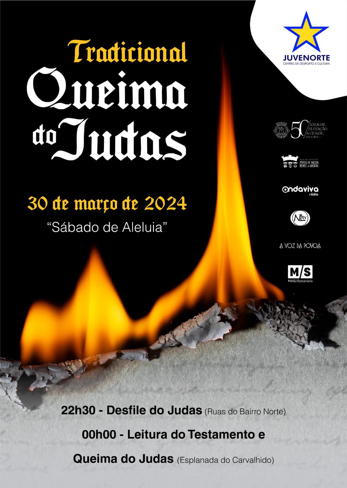 “Como tem sido hábito, de forma ininterrupta desde a fundação do CDC Juvenorte em 1986, levaremos a efeito uma vez mais – na noite do próximo dia 30, na nossa bonita Esplanada do Carvalhido – a Tradicional Leitura do Testamento e posterior Queima do Judas em Sábado de Aleluia! Uma tradição bem poveira que teimamos em manter viva”, anunciou a associação.