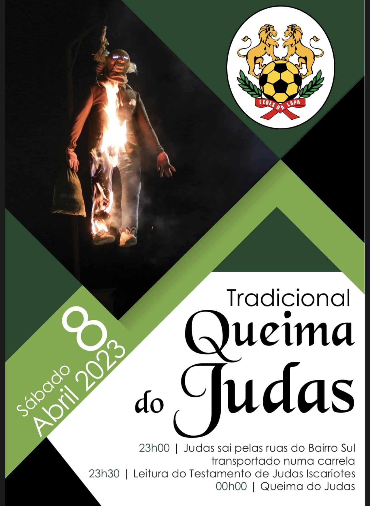 O Judas sai pelas ruas do Bairro Sul pelas 23 horas de sábado, transportado numa carrela. Às 23h30, é lido o testamento, e à meia-noite o Judas é queimado. “Apareçam”, convida o Leões da Lapa.