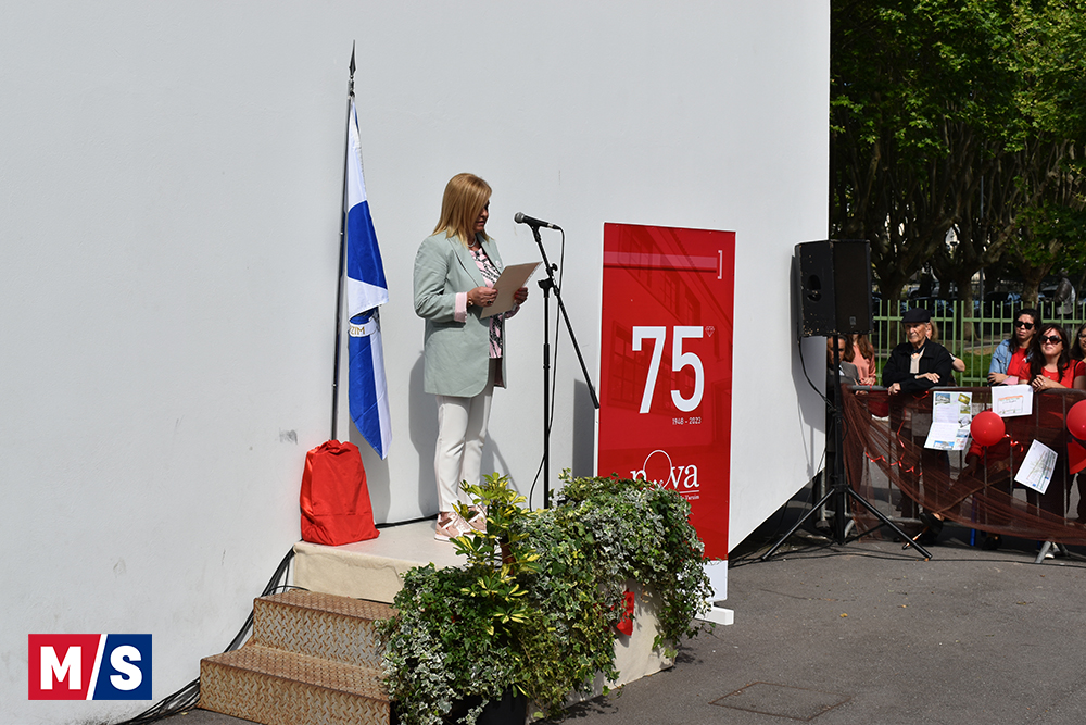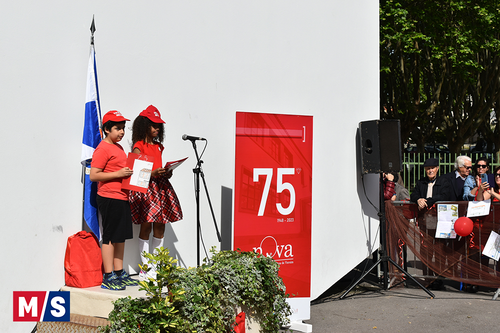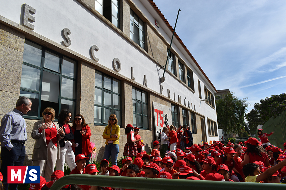 Foi na parte pública do dia, de manhã, que, perante dezenas de alunos, pais, encarregados de educação e amigos, foi descerrada a placa comemorativa dos 75 anos, na parte da frente da escola, e declamada poesia, tal como aconteceu na inauguração.