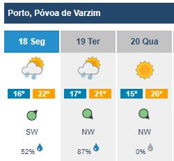 Já na quarta-feira, os termómetros voltam a aumentar, com uma máxima prevista de 26ºC para a Póvoa de Varzim e de 25ºC para Vila do Conde. As mínimas para os dois concelhos rondam os 15ºC.