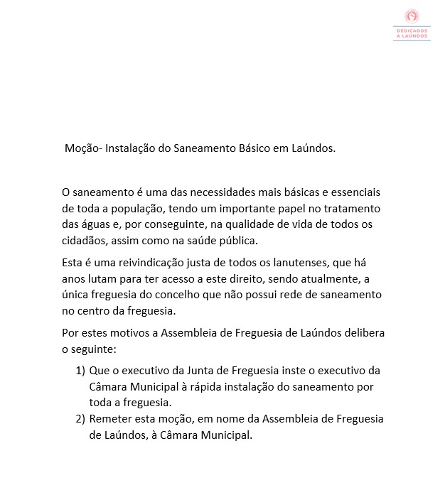 Uma moção sobre o saneamento básico em Laúndos, Póvoa de Varzim, foi apresentada na sessão da Assembleia da Freguesia realizada na segunda-feira. A proposta apelava “à rápida instalação” do serviço “por toda a freguesia”.