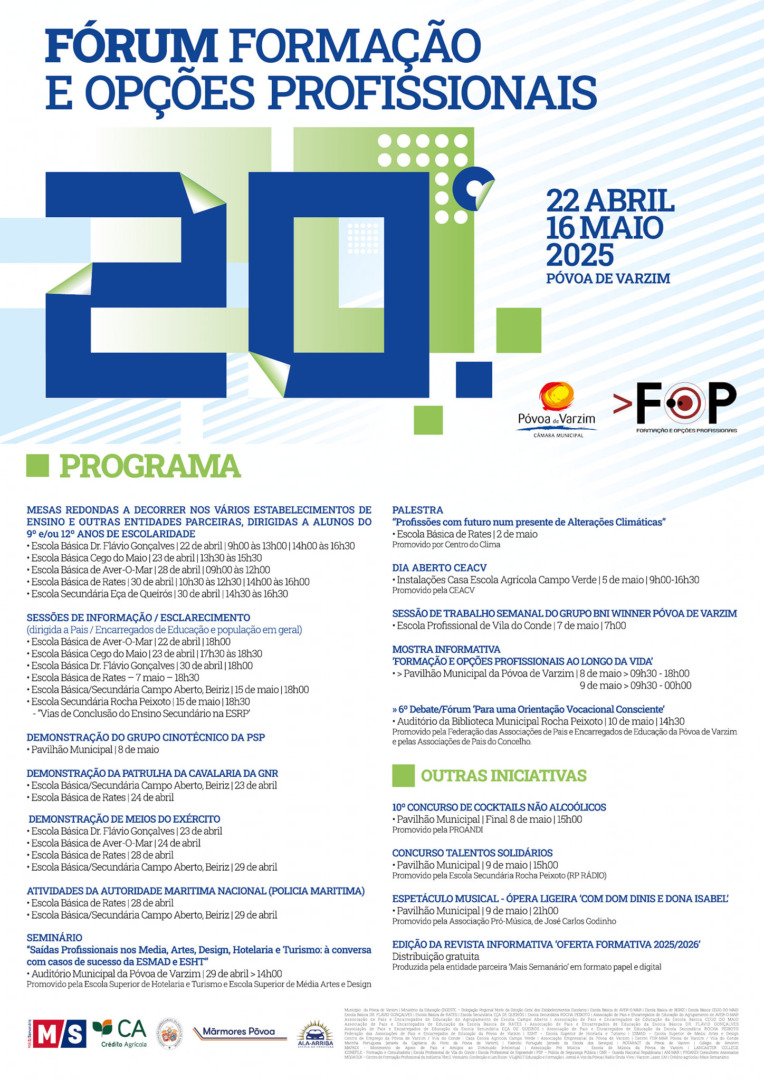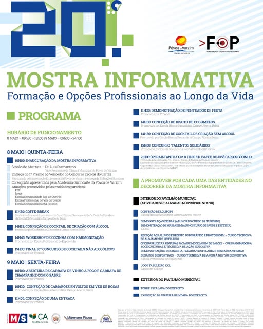 Nos dias 8 e 9 de maio, quinta e sexta-feira, o Pavilhão Municipal da Póvoa de Varzim recebe a Mostra Informativa ‘Formação e Opções Profissionais ao Longo da Vida’, uma iniciativa integrada no 20º Fórum Formação e Opções Profissionais (FOP), que se encontra a decorrer desde 22 de abril e se prolonga até 16 de maio.