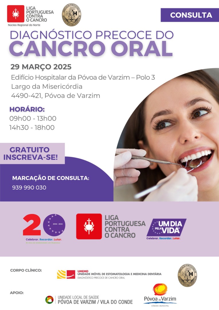 Já no final do mês, a 29 de março, a unidade hospitalar da Póvoa de Varzim vai disponibilizar consultas gratuitas para rastreio do cancro oral. Apesar de grátis, as consultas têm de ser marcadas através do contacto 939 990 030, para um horário entre as 9 e as 13 horas ou entre as 14h30 e as 18 horas.