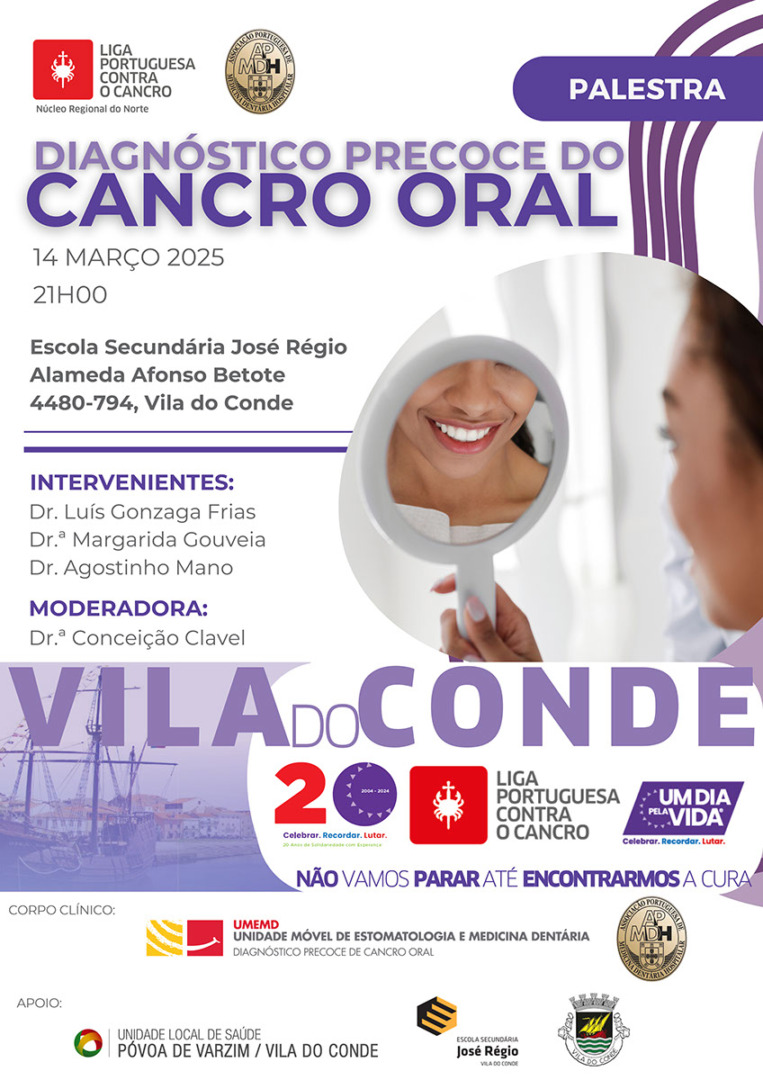 A Escola Secundária José Régio, em Vila do Conde, vai acolher no próximo dia 14 de março uma palestra dedicada ao ‘Diagnóstico Precoce do Cancro Oral’. A palestra está marcada para as 21 horas, e terá como intervenientes Luís Gonzaga Frias, Margarida Gouveia e Agostinho Mano. Conceição Clavel irá moderar a sessão.