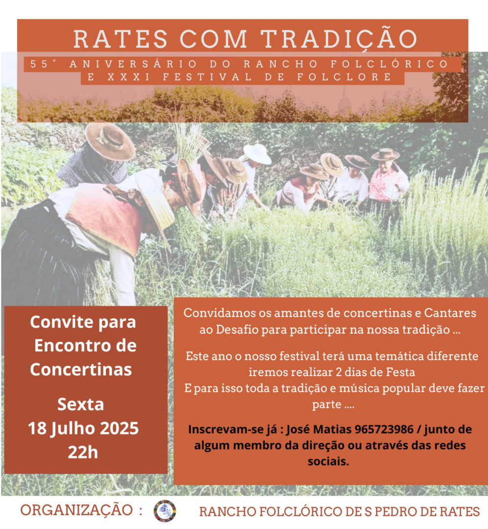 No dia 18, a partir das 18h30 o palco estará sempre ocupado com várias atuações: começando com a Festa de Finalistas das valências infantis do Centro Social de Rates e seguindo-se o Grupo de Cantares do Linho, um Encontro de Concertinas – ao qual todos os amantes de concertinas e cantares ao desafio estão convidados, mediante inscrição – e o Grupo de Danças da Casa-Escola Agrícola Campo Verde.