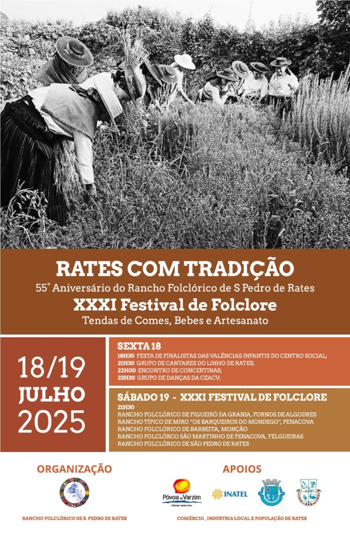O Rancho Folclórico de S. Pedro de Rates vai promover, mais uma vez, o Festival de Folclore, que todos os anos traz grupos tradicionais à freguesia poveira. Nesta que é a XXXI edição do Festival, o formato será um pouco diferente do convencional: não será apenas uma noite de festa, mas sim dois dias, com a realização da iniciativa ‘Rates com Tradição’ nos idas 18 e 19 de julho.