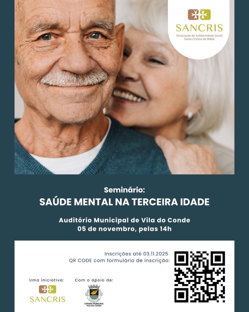 No dia 5 de novembro, pelas 14 horas, o Auditório Municipal de Vila do Conde será palco do seminário “Saúde Mental na Terceira Idade”, uma iniciativa promovida pela SANCRIS, com o apoio da Câmara Municipal de Vila do Conde. As inscrições decorrem até ao dia 3 de novembro e podem ser efetuadas no QR code na imagem.