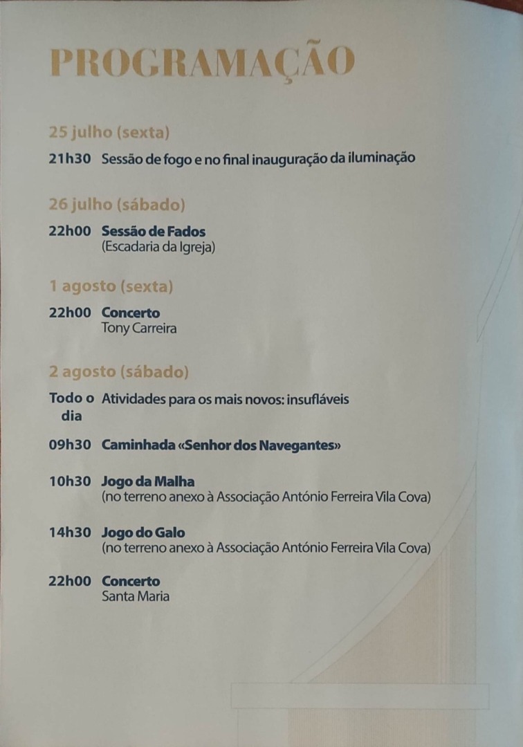 Mas não só de concertos se faz o programa: as festas arrancam com a sessão de fogo e inauguração da iluminação, pelas 21h30 de 25 de julho, e há espaço para uma sessão de fados (22 horas de 26 de julho), bem como para uma caminhada e jogos tradicionais, no dia 2 de agosto.