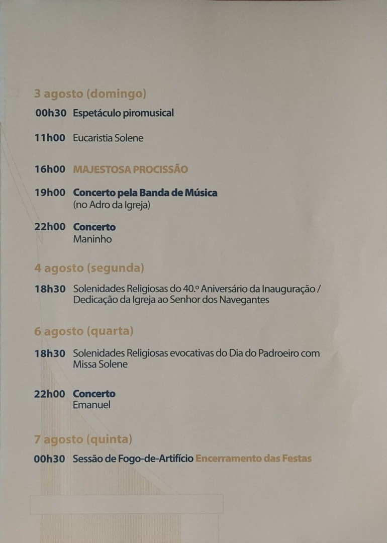 A procissão do Senhor dos Navegantes está marcada para as 16 horas de 3 de agosto, seguida de um concerto pela Banda de Música, às 19 horas. As solenidades religiosas do 40º aniversário da inauguração da Igreja ao Senhor dos Navegantes serão celebradas às 18h30 de 4 de agosto, e as solenidades religiosas evocativas do Dia do Padroeiro, com missa solene, às 18h30 de 6 de agosto. As festas terminam nessa noite, com fogo de artifício.