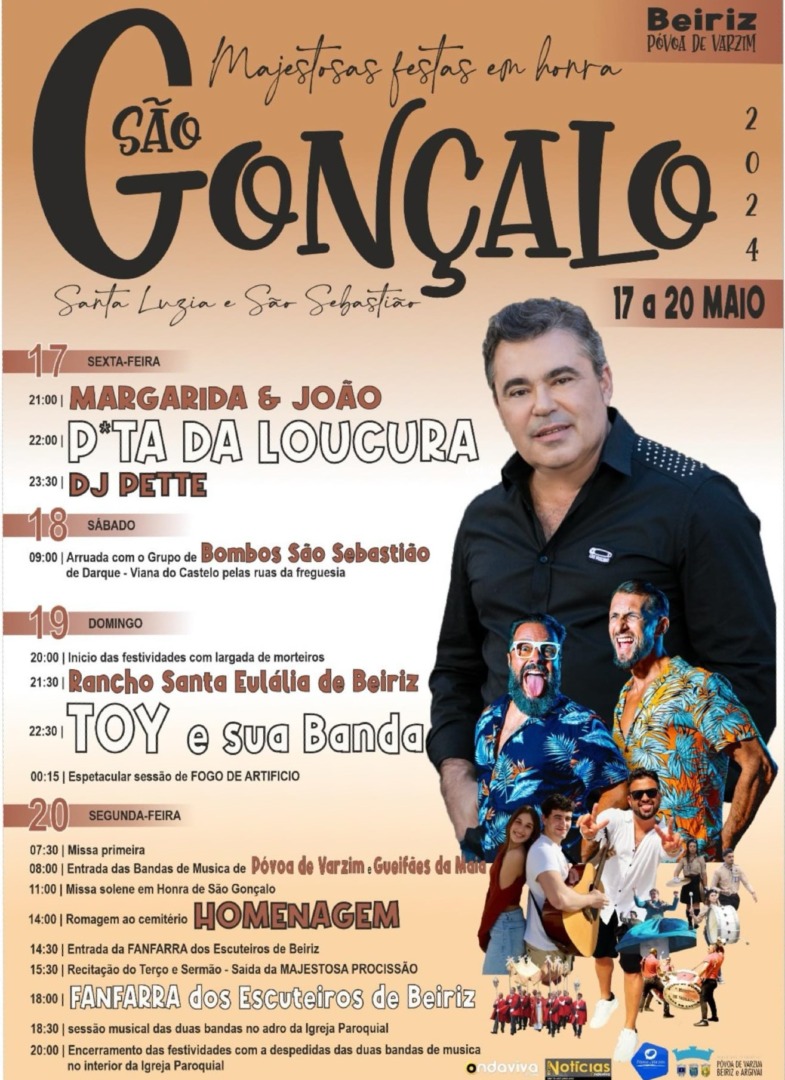 O cantor português Toy vai dar um concerto em Beiriz no domingo (19), no âmbito das Festas em honra de S. Gonçalo, Santa Luzia e S. Sebastião. O espetáculo está marcado para as 22h30, depois da atuação do Rancho Santa Eulália de Beiriz.