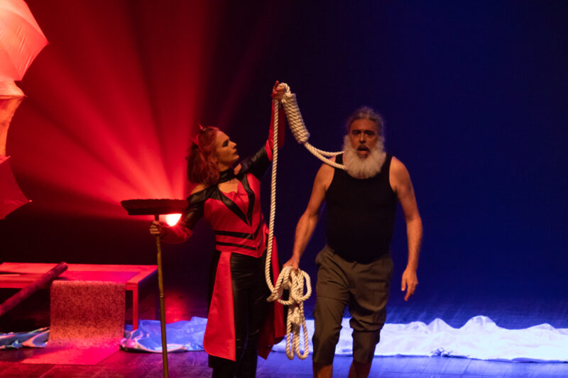 A companhia aposta numa interpretação marcada pelo dinamismo e pelo humor, recorrendo apenas a dois atores para dar vida a cerca de vinte personagens, apoiados por um grupo de figurantes voluntários e por uma marioneta de grandes dimensões que reforça o impacto visual do espetáculo. A encenação preserva a mensagem moralizante criada por Gil Vicente, na qual diferentes figuras da sociedade se confrontam com o Anjo e o Diabo, cada um à frente da sua barca, enquanto tentam justificar o destino que acreditam merecer.